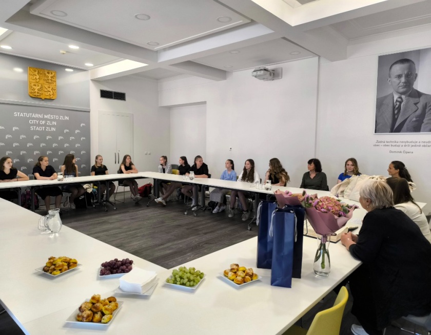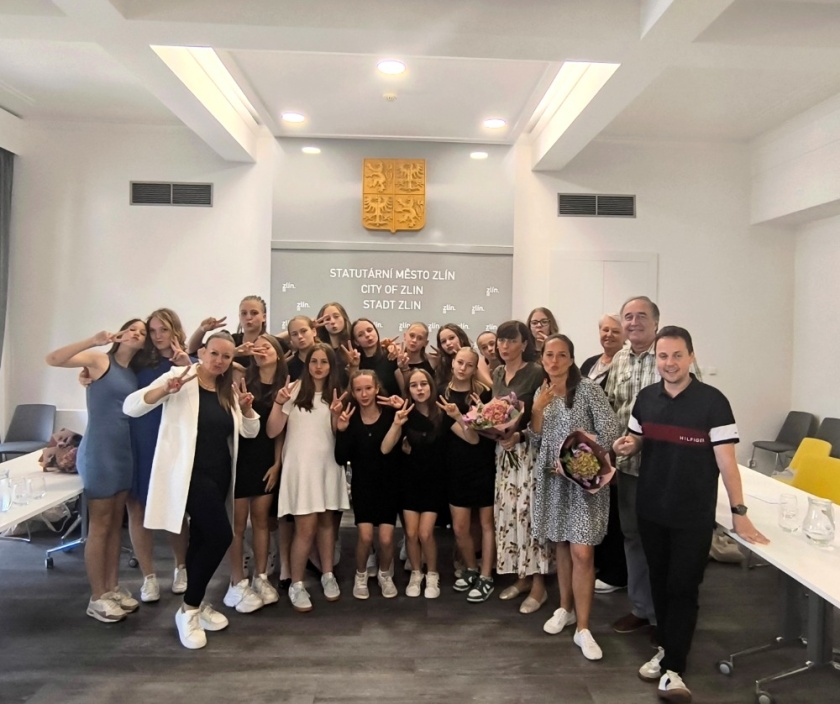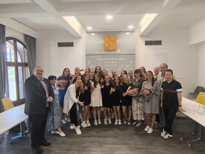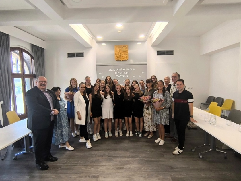 Naše žákyně, které vyhrály republikový titul v házené základních škol, byly oceněny na zlínské radnici náměstkyněmi primátora paní Hladíkovou a paní Bazelovou a vedoucím odboru školství panem Smolou.